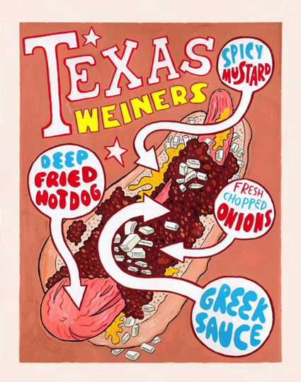 Check out http://www.hawkkrall.net as a home base for his art blog, food blog, and print shop. Click through the jump for a gallery of his wonderful hot dog illustrations, showcasing some of the best hot dogs in the world.